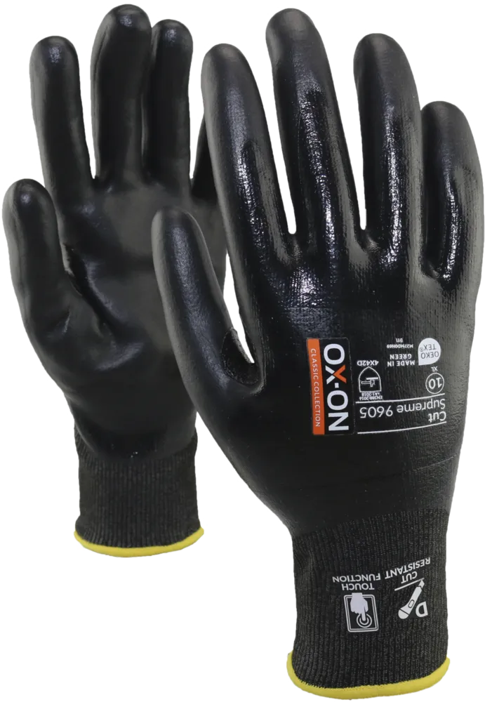 OX-ON Cut Supreme 9605 er en 100 % vandtæt og særdeles skærehæmmende (cut D) handske til dig, der vil have det bedste udstyr og arbejder som fx mekaniker, glarmester, smed eller i industri, renovation eller montage. Som noget helt særligt er denne handske dobbeltdyppet og med touch.
